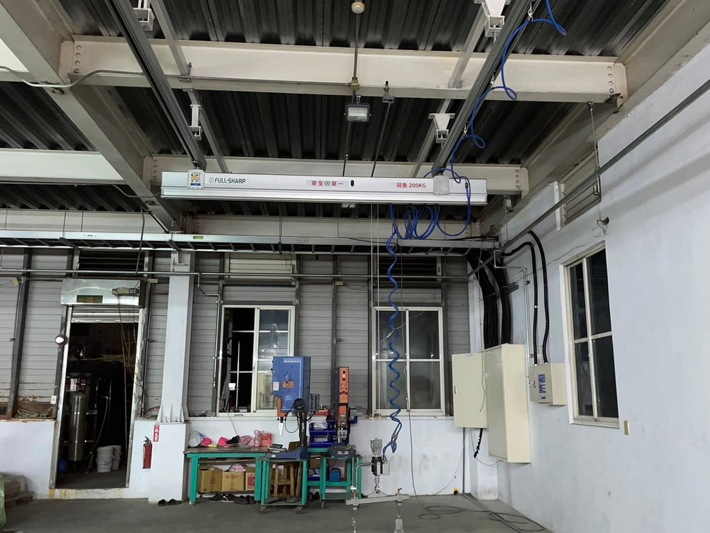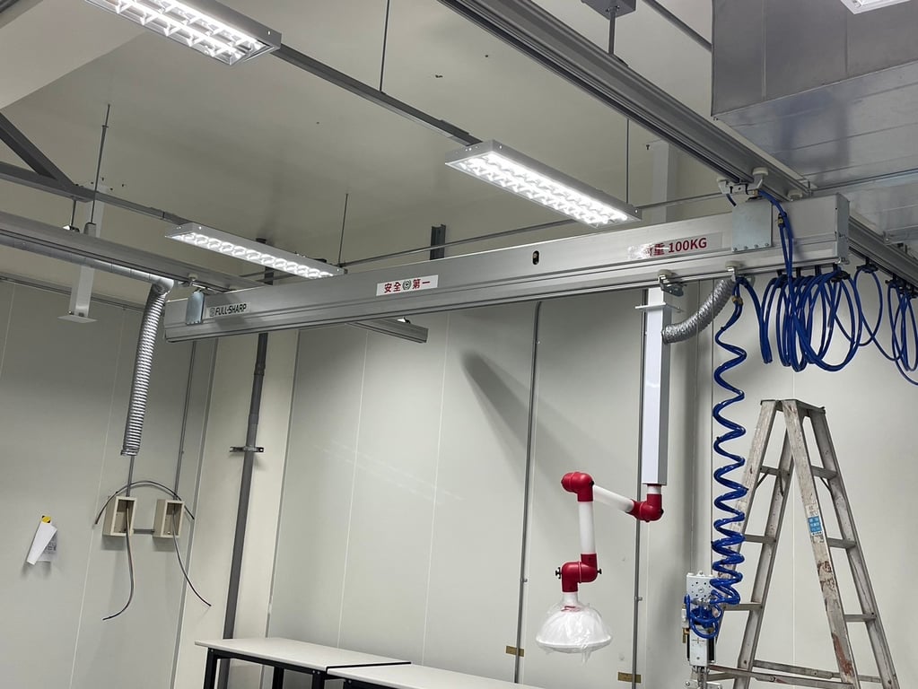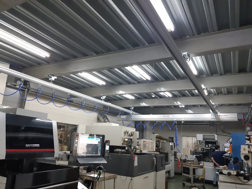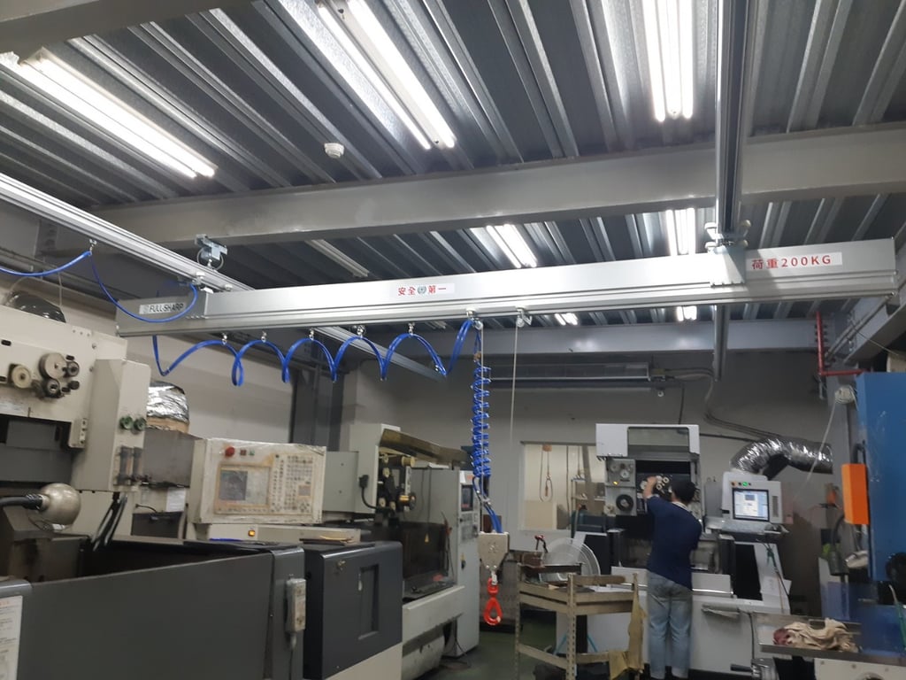 Hệ thống thanh ray nhôm treo trần kết hợp cầu trục khí nén bên dưới. Vận hành mượt mà, không cần điện, linh hoạt di chuyển. Giải pháp nâng hạ thông minh cho nhà xưởng. Liên hệ ngay!