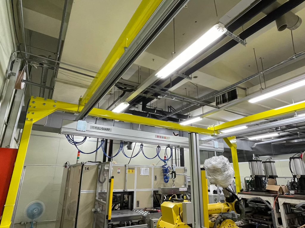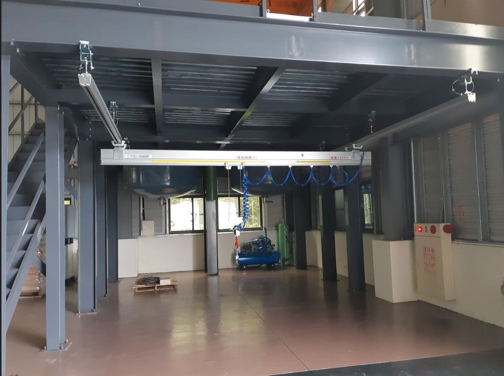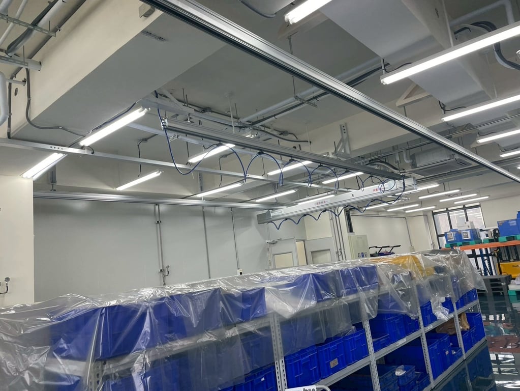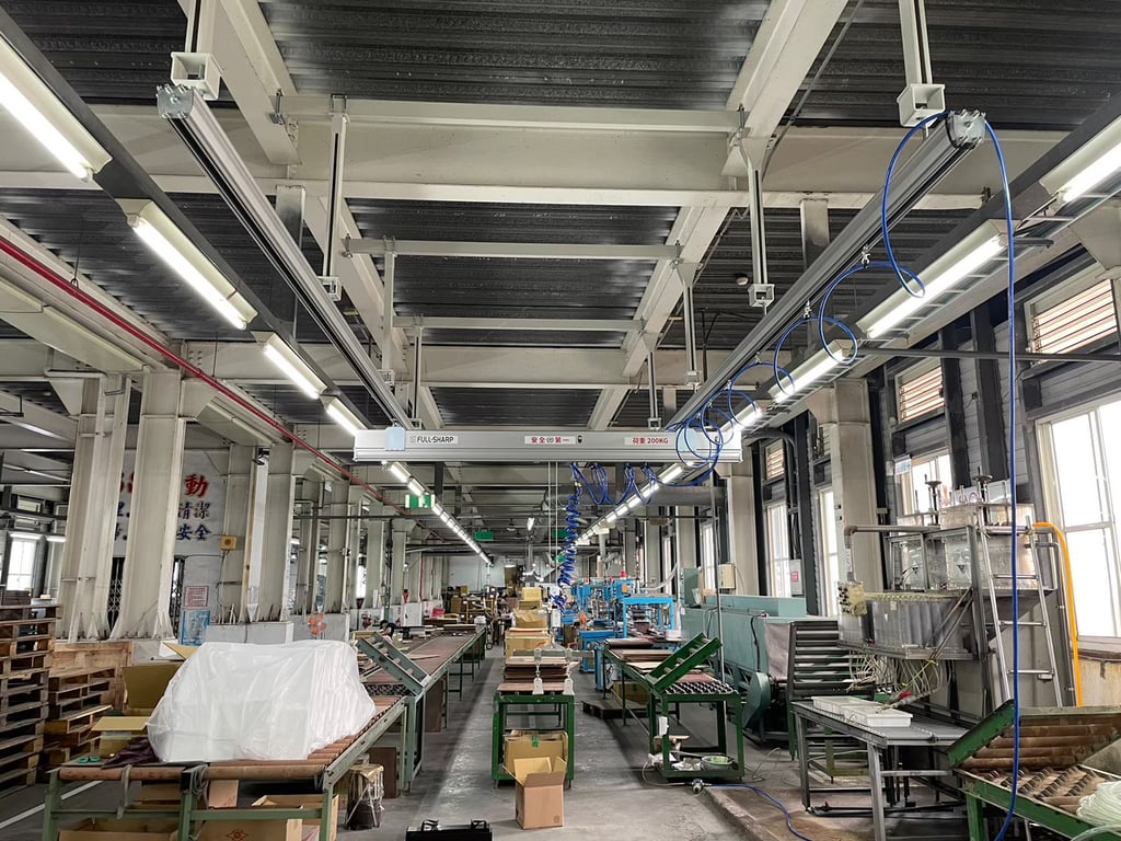Hệ thống thanh ray nhôm treo trần kết hợp cầu trục khí nén bên dưới. Vận hành mượt mà, không cần điện, linh hoạt di chuyển. Giải pháp nâng hạ thông minh cho nhà xưởng. Liên hệ ngay!