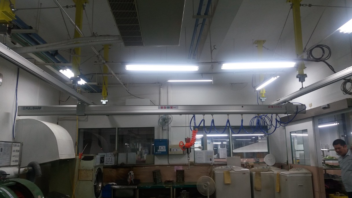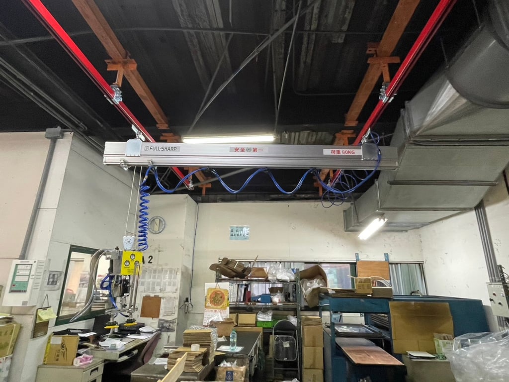Cầu trục khí nén treo thanh ray nhôm treo trần nhà với tay cầm cảm ứng lực thông minh. Tải trọng 80kg, tiết kiệm không gian, vận hành mượt mà. Giải pháp tối ưu cho nhà máy sản xuất.