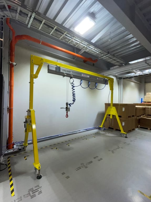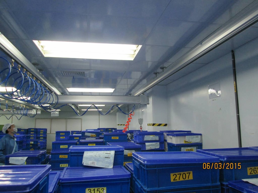 Cầu trục khí nén treo thanh ray cho phòng sạch. Tool móc khay nhựa thiết kế theo yêu cầu, nâng hạ chính xác thùng nhựa có mã số. An toàn, không bụi, phù hợp kho lạnh và phòng sạch.