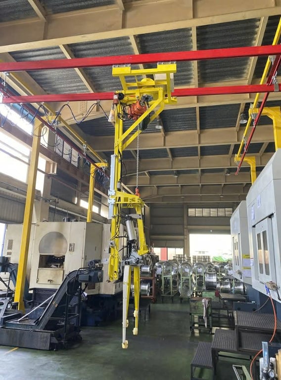 Hệ thống bộ khung thanh ray treo 500kg tích hợp tool kẹp mâm xe đưa vào máy CNC. Cân bằng khí nén, di chuyển mượt mà trên ray, an toàn tuyệt đối cho nhà máy gia công cơ khí, sản xuất ô tô.
